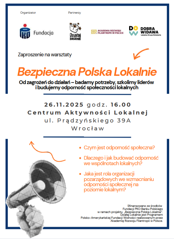 Na te kluczowe pytania wspólnie poszukamy odpowiedzi na spotkaniu dla organizacji pozarządowych, przeprowadzonym przez Fundację PKO Banku Polskiego oraz Lokalną Grupę Działania Dobra Widawa – realizatora programu „Działaj Lokalnie” Polsko-Amerykańskiej Fundacji Wolności.